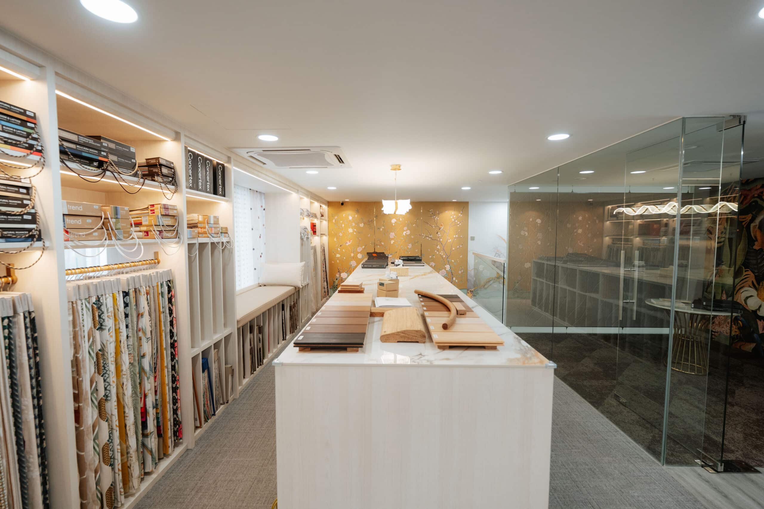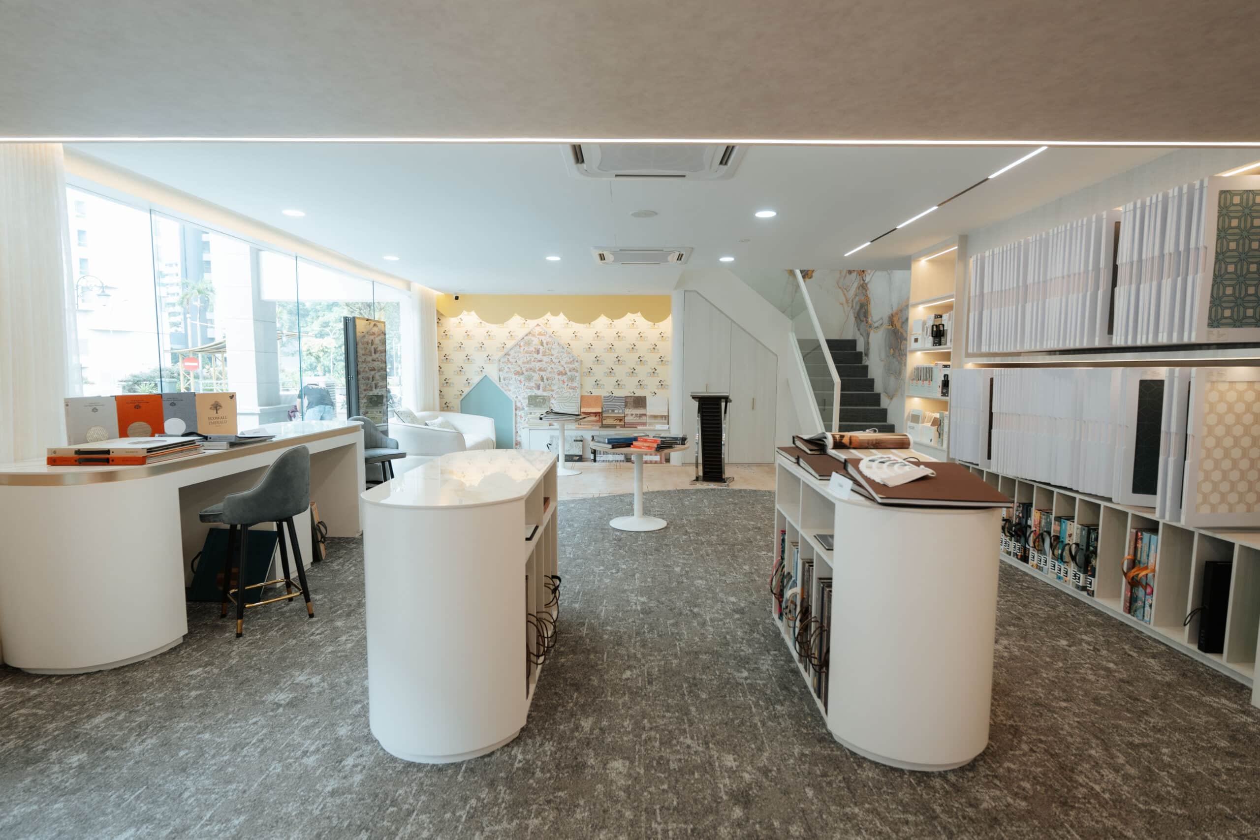 Featured Products & Brands: The first floor offers a mix of products including hand-painted wallcoverings and murals from Elitis, which create a distinctive and artistic ambiance. The VIP meeting room is adorned with Elitis murals and Mohawk carpet tiles, blending luxury with functionality. The staircase area features hand-painted wallcoverings, adding a touch of elegance to the gallery’s interior. The first floor features a diverse range of products with an estimated over 500 SKUs on display, offering visitors an extensive selection of wallcoverings, carpets, flooring, and fabrics.