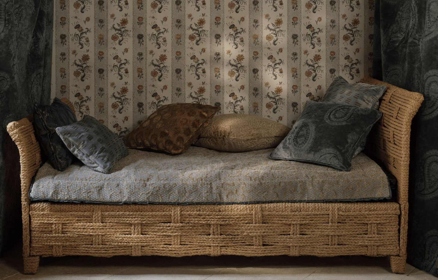 This richly ornamented curation of figured velvets features intricate motifs, from vermicelli patterns to blurred ikat spots. Crafted with jacquard and embroidery techniqu