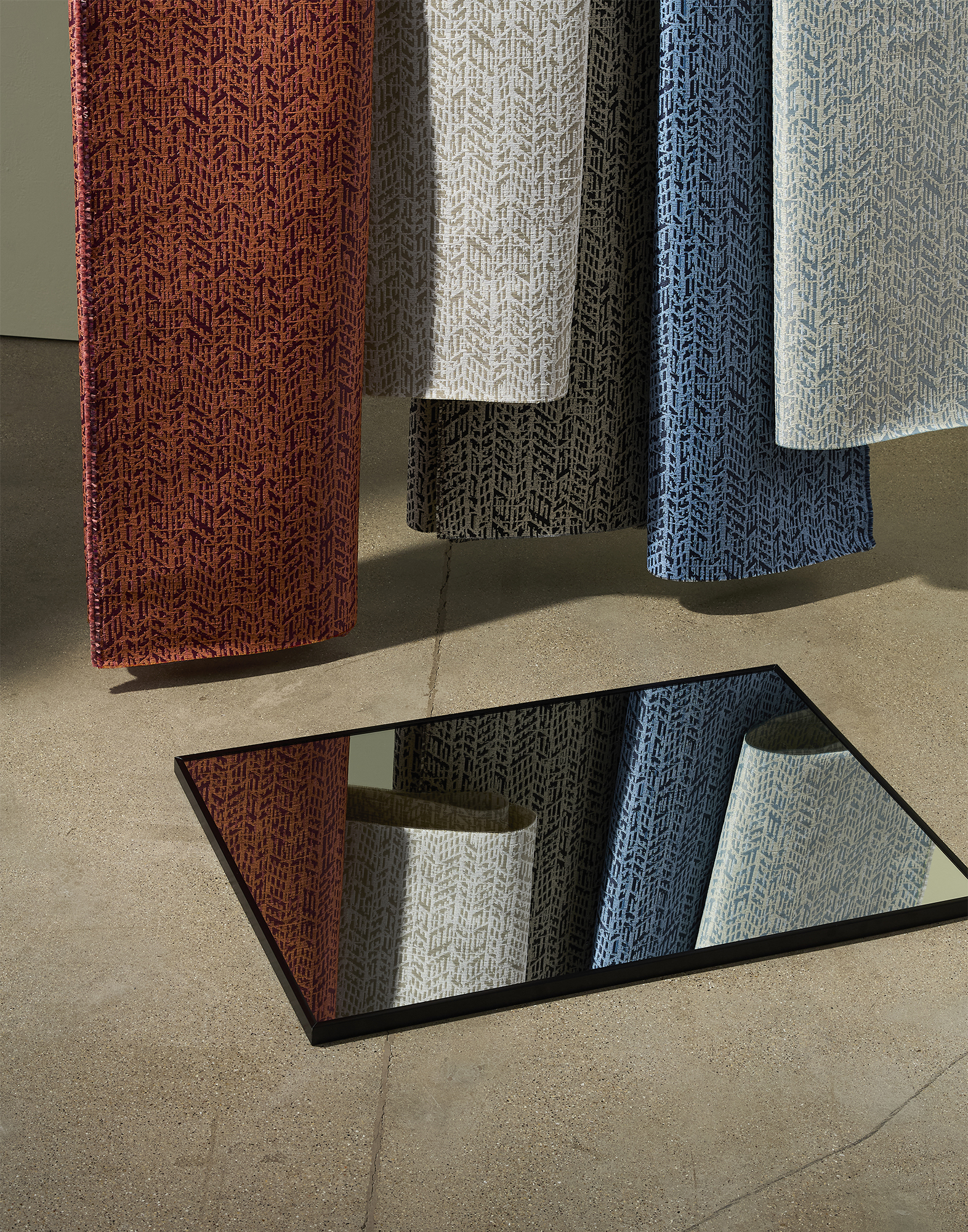 With a pattern that fractures and reforms like a deconstructed chevron or a cityscape in motion, Escher transforms structure into surprise. Inspired by the visual riddles of its namesake, the design turns perception into a game—one that rewards a second glance. The colors are named after different architectural materials – Sand, Porcelain, Glass, Cement, Brick, Bluestone, Wood, and Iron. Woven with 28% post-consumer recycled polyester, it combines performance with artistic expression, holding strong through over 200,000 double rubs and offering bleach cleanability.