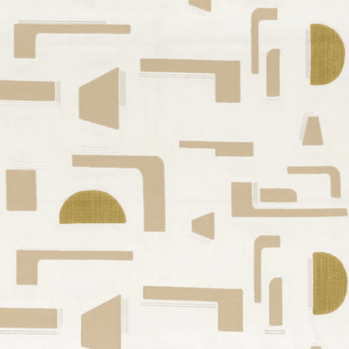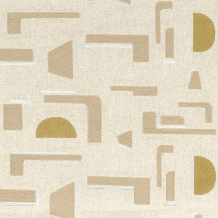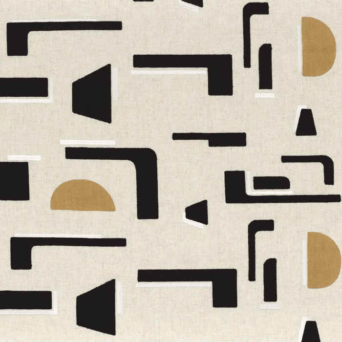 The magnificent embroidered and printed ISOTOPE fabric has a rich and subtle graphic design. The geometric patterns are embellished with 2 different embroidery stitches and yarns: the first, with a cotton and wool look, is embroidered using a very dense chain stitch giving remarkable volume. The second has a silky look and is embroidered with an elegant satin stitch. The hand-made block-print that makes up the design is lifted by golden ink. The combination of designs and techniques creates contrasting materials that catch the light and a fabric with a unique character.