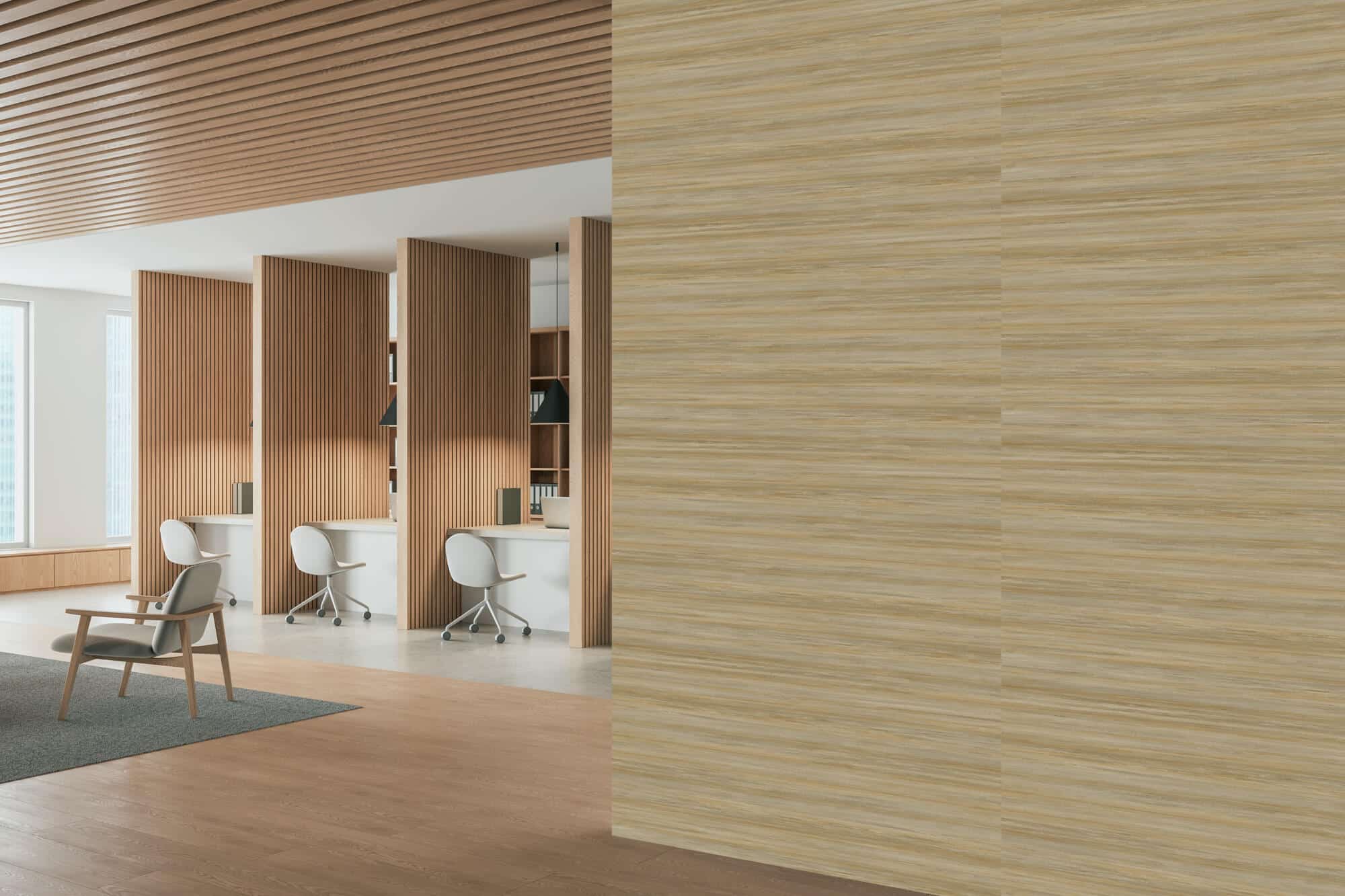 Sundar Grove by Koroseal is a vinyl wallcovering designed by Patty Madden, featuring a woven backing and a reverse hang, random match pattern. Available in 10 nature-inspired colorways like Riverstone, Neem Leaf, and Silkroot, it blends organic texture with commercial-grade durability—ideal for stylish, high-performance interiors.
